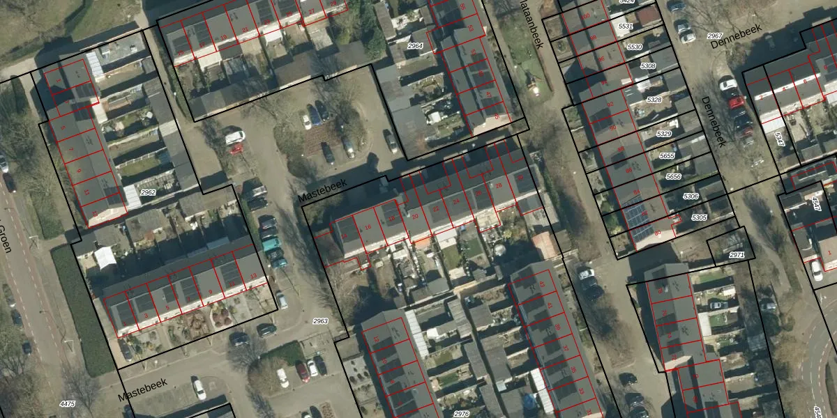 Het perceel waarop Mastebeek 20 staat heeft een oppervlakte van 6424 m². Dit is een zeer groot perceel. De perceeloppervlakte wordt geregistreerd door het Kadaster. Gedetailleerde informatie over de maten van dit perceel kunt u vinden in het rapport Kadastrale kaart met maatvoering van Mastebeek 20.