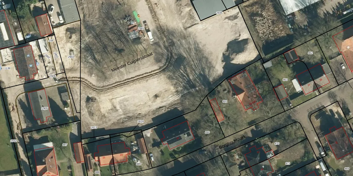 Het perceel waarop Meester Cuijpersstraat 32 staat heeft een oppervlakte van 8772 m². Dit is een zeer groot perceel. De perceeloppervlakte wordt geregistreerd door het Kadaster. Gedetailleerde informatie over de maten van dit perceel kunt u vinden in het rapport Kadastrale kaart met maatvoering van Meester Cuijpersstraat 32.