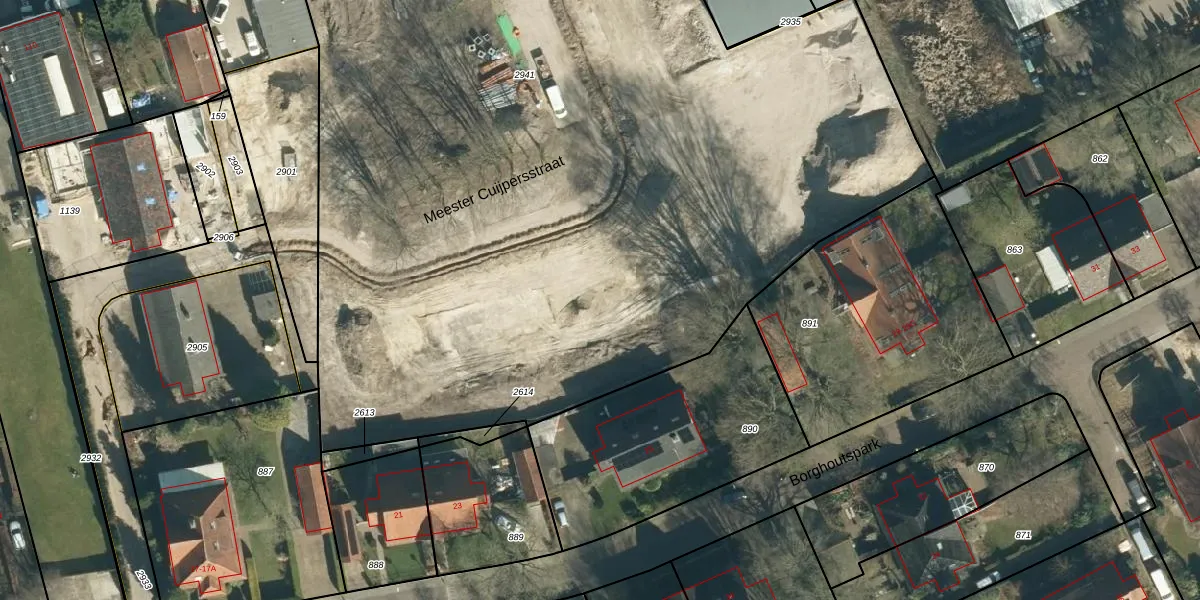 Het perceel waarop Meester Cuijpersstraat 34 staat heeft een oppervlakte van 8772 m². Dit is een zeer groot perceel. De perceeloppervlakte wordt geregistreerd door het Kadaster. Gedetailleerde informatie over de maten van dit perceel kunt u vinden in het rapport Kadastrale kaart met maatvoering van Meester Cuijpersstraat 34.