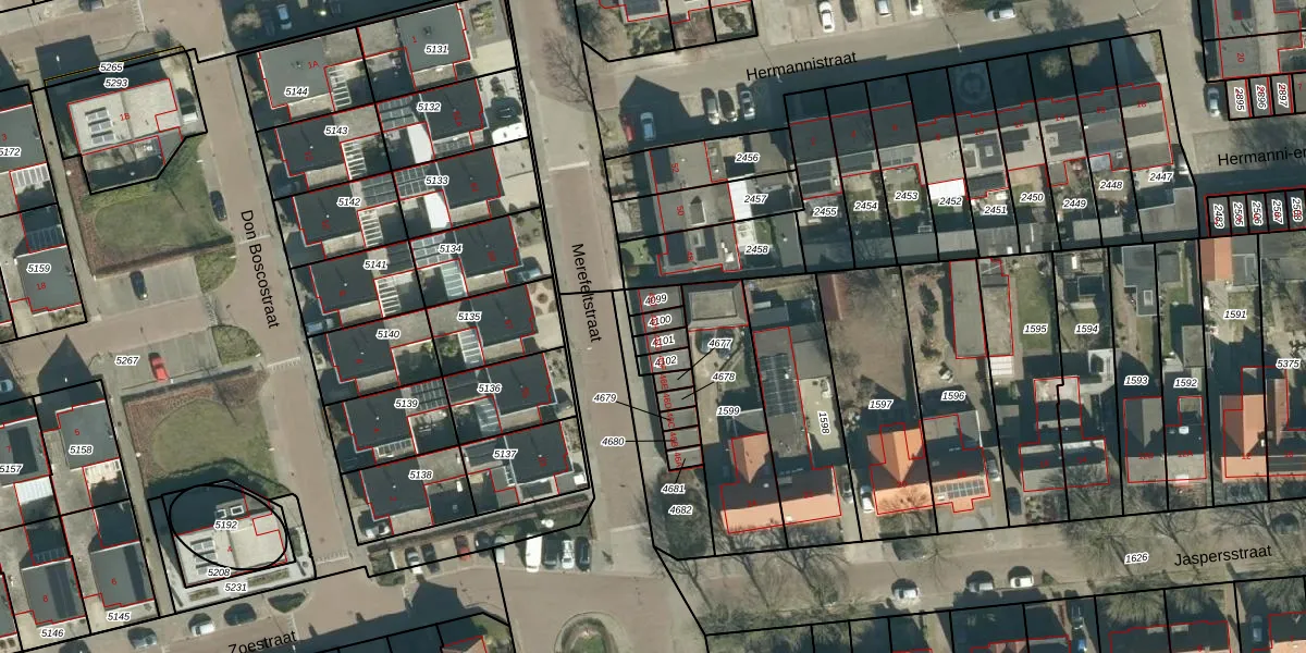 Gebruik de zoekbalk of klik op een perceel voor informatie over de adressen binnen dit perceel.