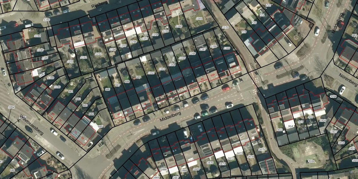 Het perceel waarop Middelberg 61 staat heeft een oppervlakte van 198 m². Dit is een middelgroot perceel. De perceeloppervlakte wordt geregistreerd door het Kadaster. Gedetailleerde informatie over de maten van dit perceel kunt u vinden in het rapport Kadastrale kaart met maatvoering van Middelberg 61.