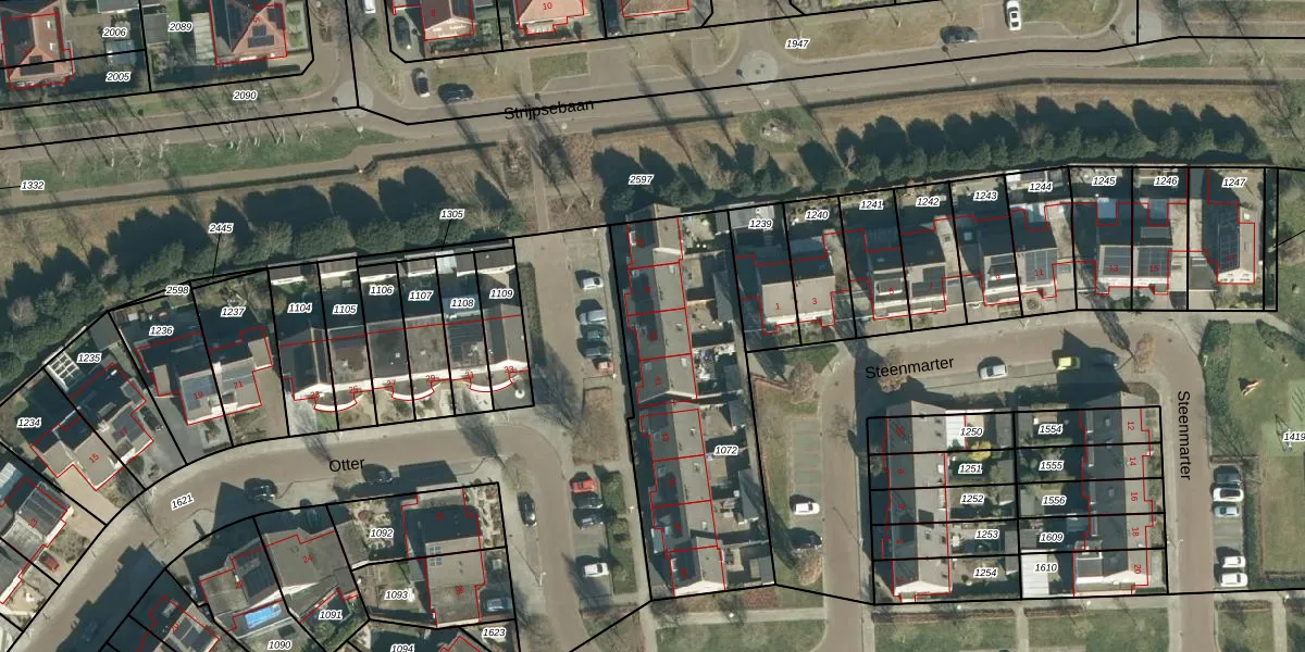 Het perceel waarop Otter 39 staat heeft een oppervlakte van 1085 m². Dit is een zeer groot perceel. De perceeloppervlakte wordt geregistreerd door het Kadaster. Gedetailleerde informatie over de maten van dit perceel kunt u vinden in het rapport Kadastrale kaart met maatvoering van Otter 39.