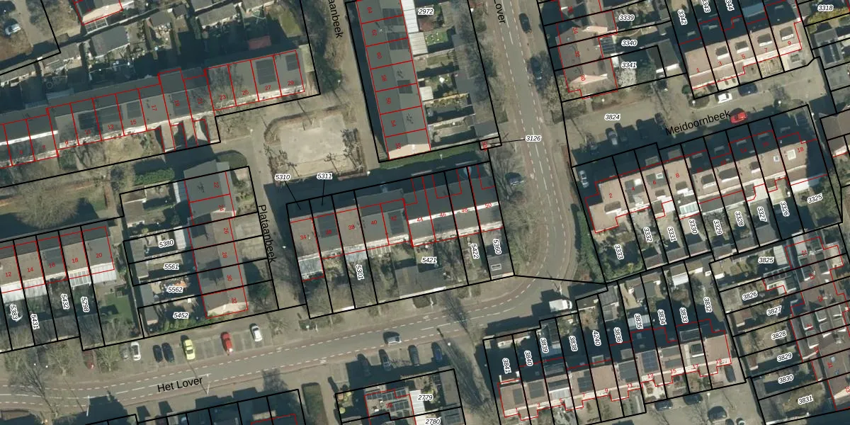 Plataanbeek 44 is gelegen op kadastraal perceel VHV01D5421. Deze kadastrale aanduiding is uniek en wordt gebruikt door het Kadaster om eigendomsrechten en andere zakelijke rechten vast te leggen. Het perceel maakt onderdeel uit van de kadastrale gemeente Veldhoven.