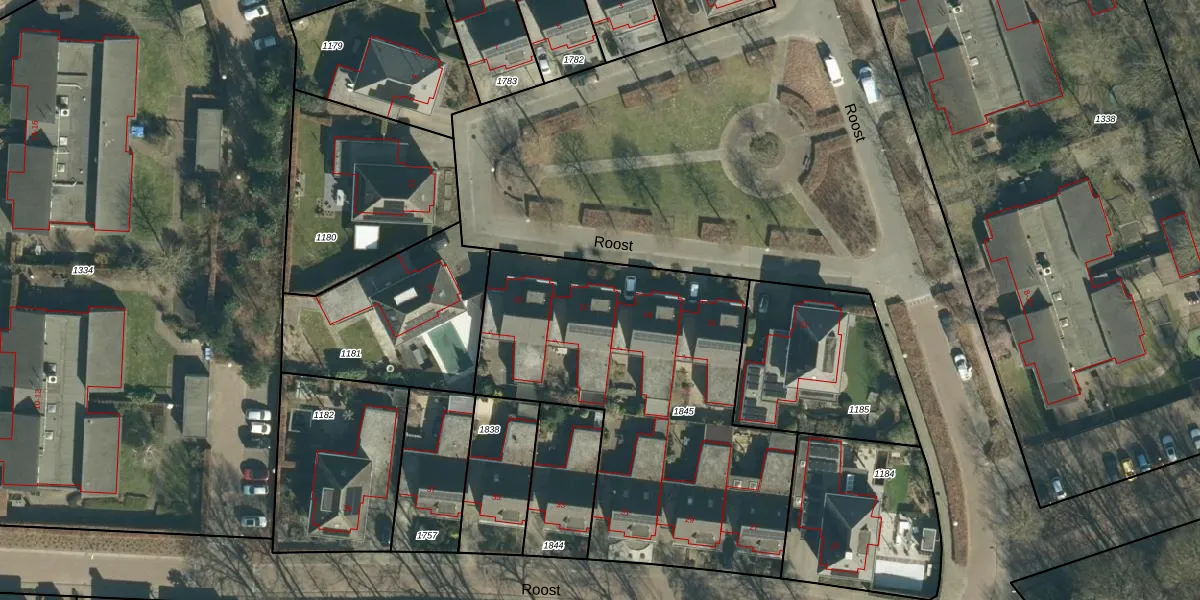 Het perceel waarop Roost 17 staat heeft een oppervlakte van 1856 m². Dit is een zeer groot perceel. De perceeloppervlakte wordt geregistreerd door het Kadaster. Gedetailleerde informatie over de maten van dit perceel kunt u vinden in het rapport Kadastrale kaart met maatvoering van Roost 17.