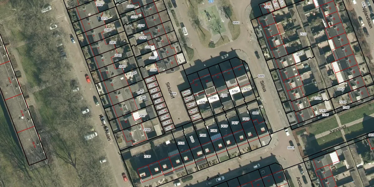 Het perceel waarop Siriuserf 1 staat heeft een oppervlakte van 21 m². Dit is een klein perceel. De perceeloppervlakte wordt geregistreerd door het Kadaster. Gedetailleerde informatie over de maten van dit perceel kunt u vinden in het rapport Kadastrale kaart met maatvoering van Siriuserf 1.