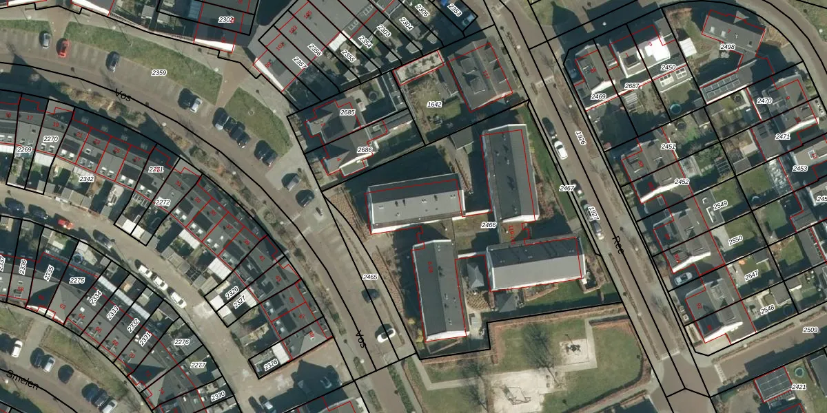 Het perceel waarop Vos 14 staat heeft een oppervlakte van 2490 m². Dit is een zeer groot perceel. De perceeloppervlakte wordt geregistreerd door het Kadaster. Gedetailleerde informatie over de maten van dit perceel kunt u vinden in het rapport Kadastrale kaart met maatvoering van Vos 14.
