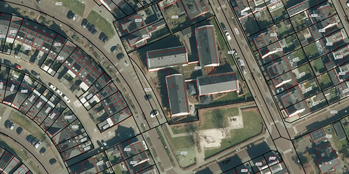 Het perceel waarop Vos 18 staat heeft een oppervlakte van 2490 m². Dit is een zeer groot perceel. De perceeloppervlakte wordt geregistreerd door het Kadaster. Gedetailleerde informatie over de maten van dit perceel kunt u vinden in het rapport Kadastrale kaart met maatvoering van Vos 18.