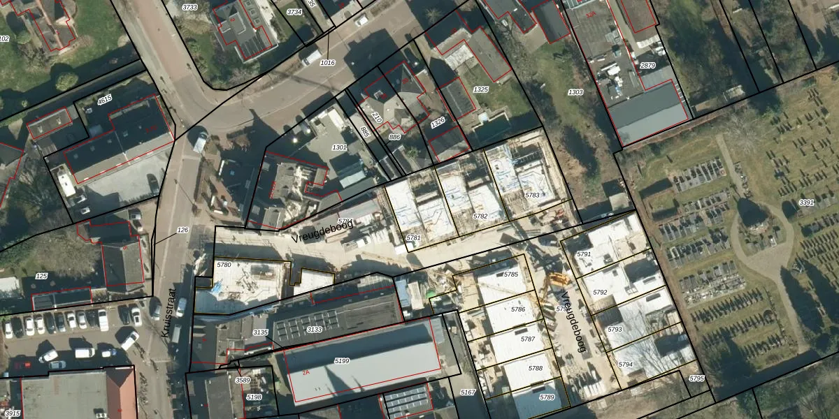 Vreugdeboog 1 is gelegen op kadastraal perceel VHV01D5781. Deze kadastrale aanduiding is uniek en wordt gebruikt door het Kadaster om eigendomsrechten en andere zakelijke rechten vast te leggen. Het perceel maakt onderdeel uit van de kadastrale gemeente Veldhoven.
