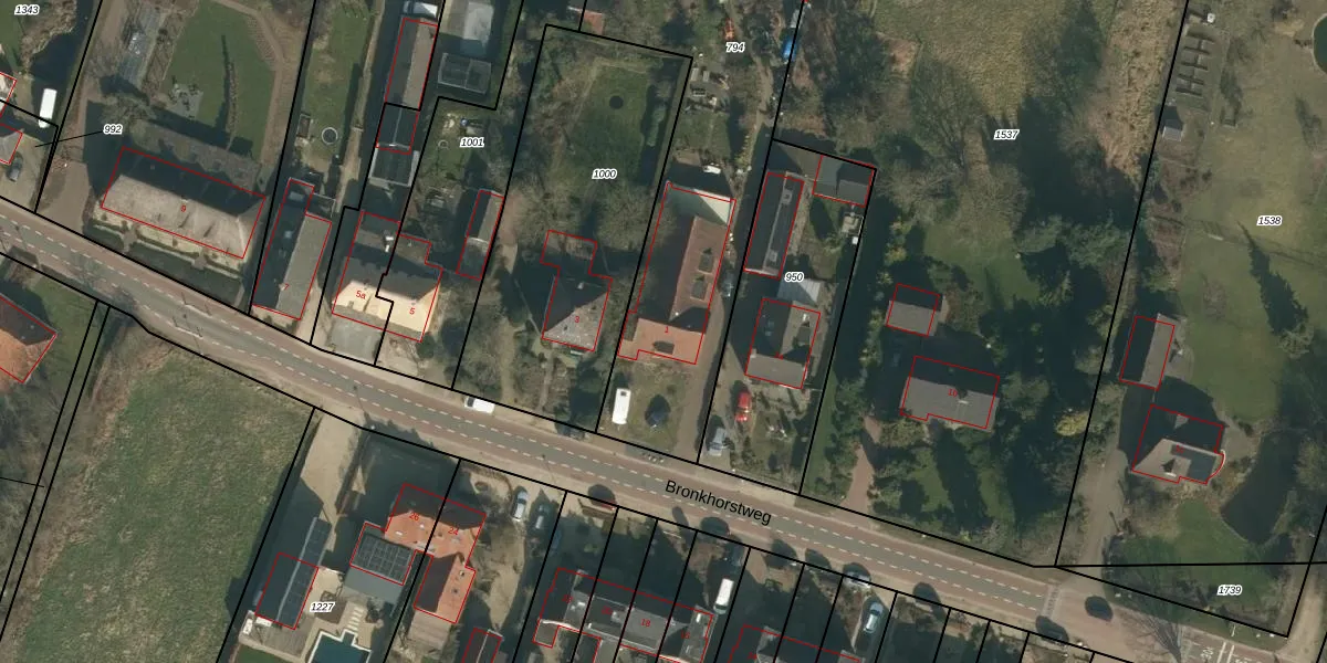 Het perceel waarop Bronkhorstweg 1 staat heeft een oppervlakte van 2345 m². Dit is een zeer groot perceel. De perceeloppervlakte wordt geregistreerd door het Kadaster. Gedetailleerde informatie over de maten van dit perceel kunt u vinden in het rapport Kadastrale kaart met maatvoering van Bronkhorstweg 1.