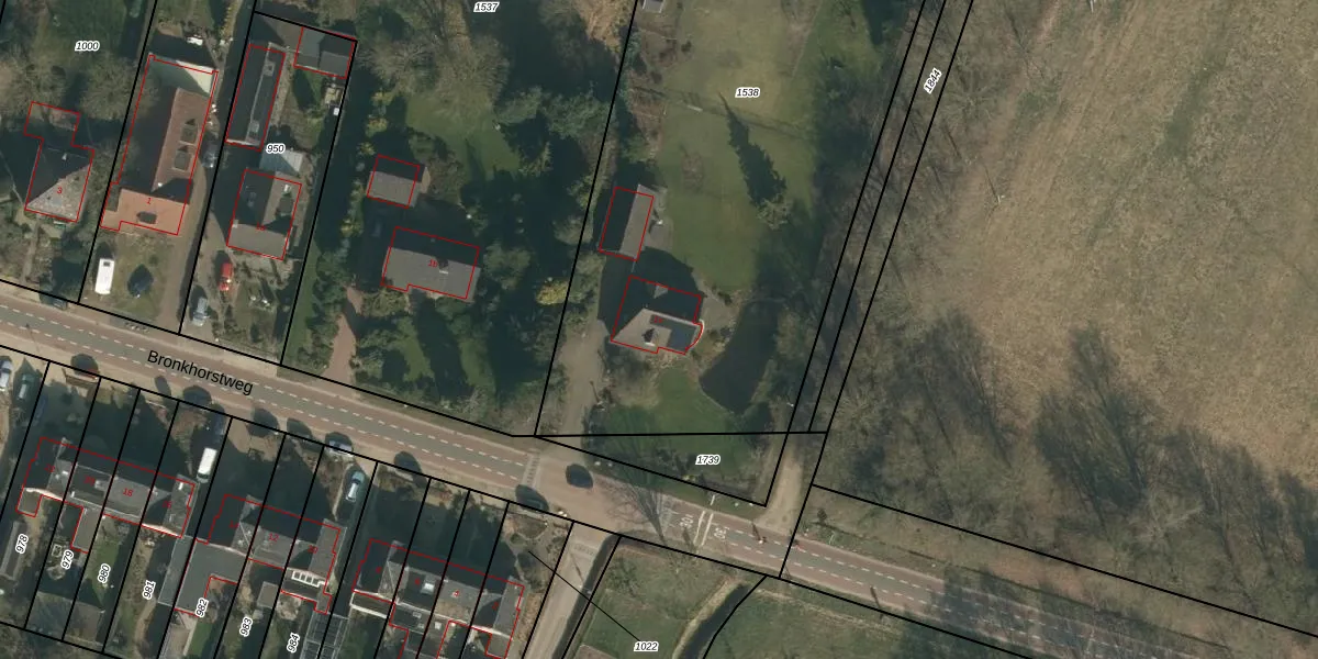 Het perceel waarop Bronkhorstweg 1-c staat heeft een oppervlakte van 3810 m². Dit is een zeer groot perceel. De perceeloppervlakte wordt geregistreerd door het Kadaster. Gedetailleerde informatie over de maten van dit perceel kunt u vinden in het rapport Kadastrale kaart met maatvoering van Bronkhorstweg 1-c.