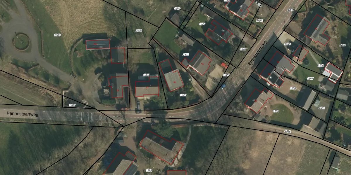 Bronkhorstweg 45 is gelegen op kadastraal perceel GVE00H1372. Deze kadastrale aanduiding is uniek en wordt gebruikt door het Kadaster om eigendomsrechten en andere zakelijke rechten vast te leggen. Het perceel maakt onderdeel uit van de kadastrale gemeente Grave.