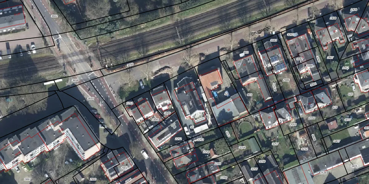 Het perceel waarop Brugweg 17 staat heeft een oppervlakte van 625 m². Dit is een groot perceel. De perceeloppervlakte wordt geregistreerd door het Kadaster. Gedetailleerde informatie over de maten van dit perceel kunt u vinden in het rapport Kadastrale kaart met maatvoering van Brugweg 17.