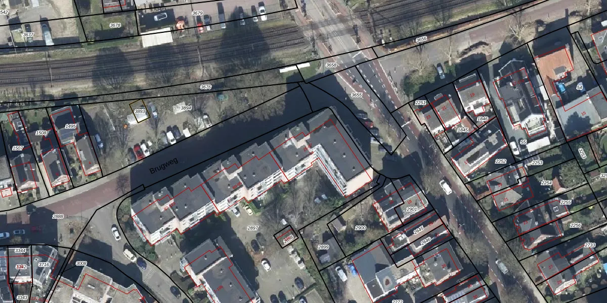 Het perceel waarop Brugweg 57 staat heeft een oppervlakte van 3838 m². Dit is een zeer groot perceel. De perceeloppervlakte wordt geregistreerd door het Kadaster. Gedetailleerde informatie over de maten van dit perceel kunt u vinden in het rapport Kadastrale kaart met maatvoering van Brugweg 57.