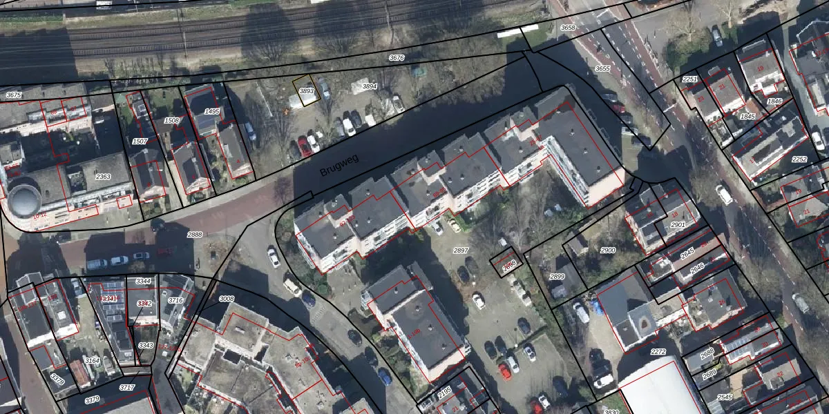 Het perceel waarop Brugweg 83 staat heeft een oppervlakte van 3838 m². Dit is een zeer groot perceel. De perceeloppervlakte wordt geregistreerd door het Kadaster. Gedetailleerde informatie over de maten van dit perceel kunt u vinden in het rapport Kadastrale kaart met maatvoering van Brugweg 83.