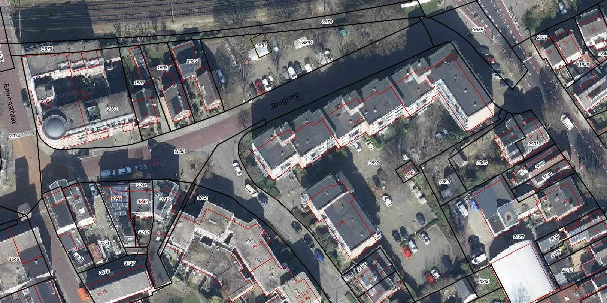 Het perceel waarop Brugweg 99 staat heeft een oppervlakte van 3838 m². Dit is een zeer groot perceel. De perceeloppervlakte wordt geregistreerd door het Kadaster. Gedetailleerde informatie over de maten van dit perceel kunt u vinden in het rapport Kadastrale kaart met maatvoering van Brugweg 99.