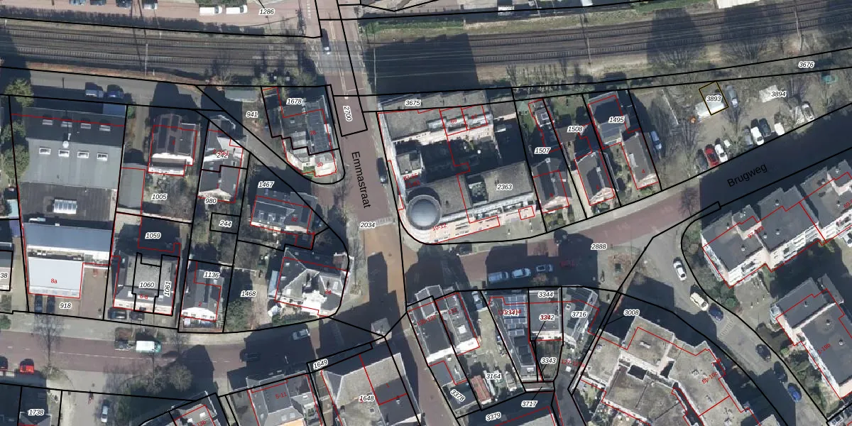 Het perceel waarop Emmastraat 75 staat heeft een oppervlakte van 1065 m². Dit is een zeer groot perceel. De perceeloppervlakte wordt geregistreerd door het Kadaster. Gedetailleerde informatie over de maten van dit perceel kunt u vinden in het rapport Kadastrale kaart met maatvoering van Emmastraat 75.