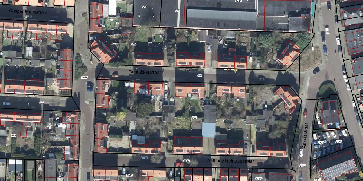 Het perceel waarop Grintakkerstraat 9 staat heeft een oppervlakte van 4430 m². Dit is een zeer groot perceel. De perceeloppervlakte wordt geregistreerd door het Kadaster. Gedetailleerde informatie over de maten van dit perceel kunt u vinden in het rapport Kadastrale kaart met maatvoering van Grintakkerstraat 9.