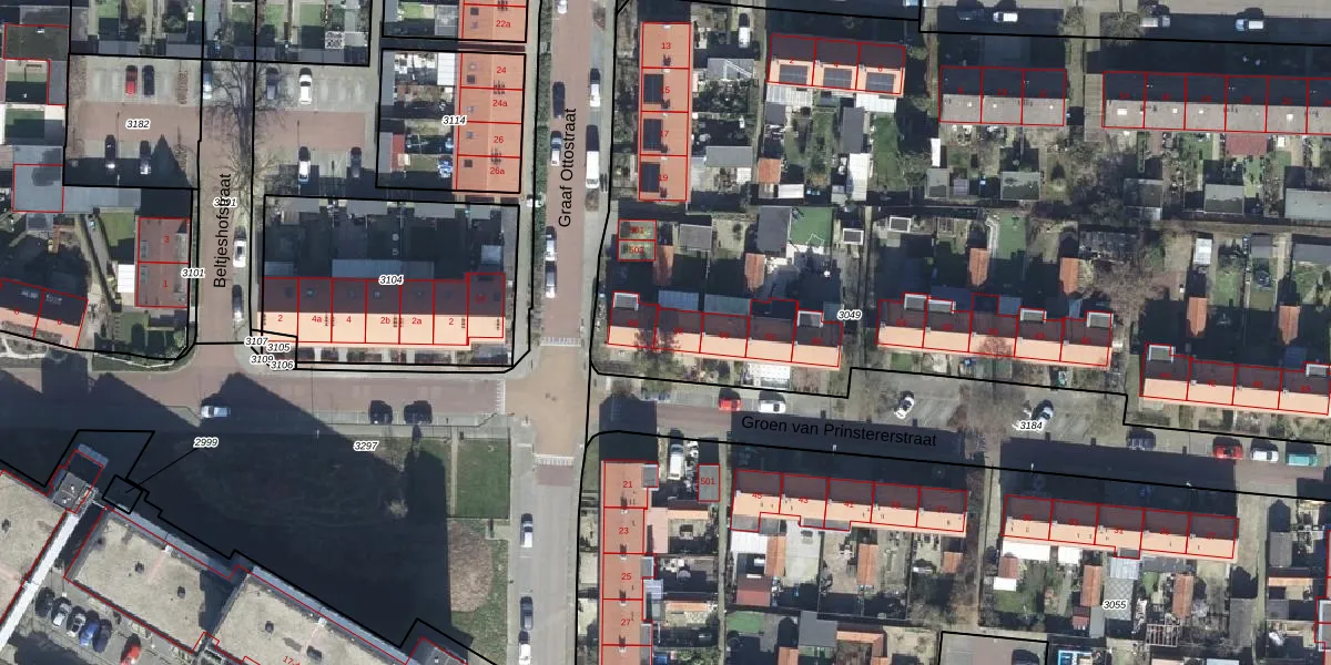 Het perceel waarop Groen van Prinstererstraat 62 staat heeft een oppervlakte van 6480 m². Dit is een zeer groot perceel. De perceeloppervlakte wordt geregistreerd door het Kadaster. Gedetailleerde informatie over de maten van dit perceel kunt u vinden in het rapport Kadastrale kaart met maatvoering van Groen van Prinstererstraat 62.