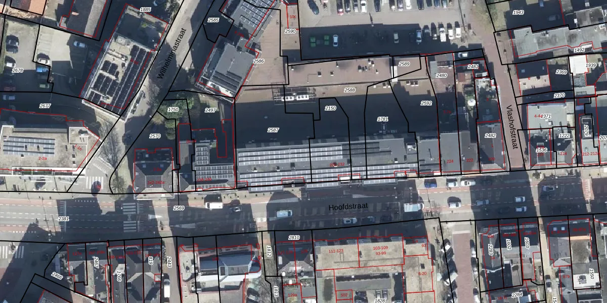 Hoofdstraat 228-v is gelegen op kadastraal perceel VEL01F2587. Deze kadastrale aanduiding is uniek en wordt gebruikt door het Kadaster om eigendomsrechten en andere zakelijke rechten vast te leggen. Het perceel maakt onderdeel uit van de kadastrale gemeente Velp Gelderland.