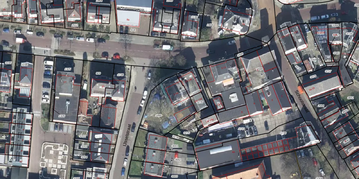 Het perceel waarop IJsselstraat 1-a3 staat heeft een oppervlakte van 630 m². Dit is een groot perceel. De perceeloppervlakte wordt geregistreerd door het Kadaster. Gedetailleerde informatie over de maten van dit perceel kunt u vinden in het rapport Kadastrale kaart met maatvoering van IJsselstraat 1-a3.