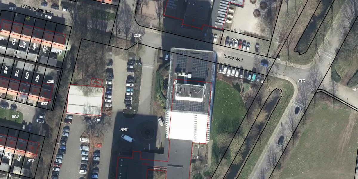 Het perceel waarop Korte Wal 1 staat heeft een oppervlakte van 1,2 ha. Dit is een zeer groot perceel. De perceeloppervlakte wordt geregistreerd door het Kadaster. Gedetailleerde informatie over de maten van dit perceel kunt u vinden in het rapport Kadastrale kaart met maatvoering van Korte Wal 1.