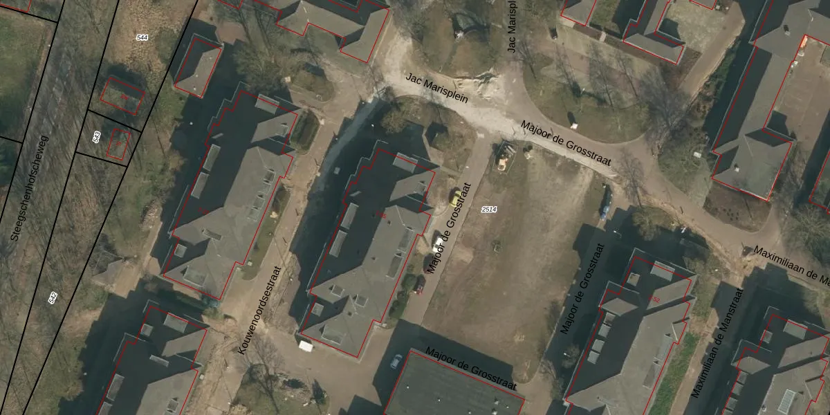 Het perceel waarop Majoor de Grosstraat 1-t staat heeft een oppervlakte van 3,6 ha. Dit is een zeer groot perceel. De perceeloppervlakte wordt geregistreerd door het Kadaster. Gedetailleerde informatie over de maten van dit perceel kunt u vinden in het rapport Kadastrale kaart met maatvoering van Majoor de Grosstraat 1-t.