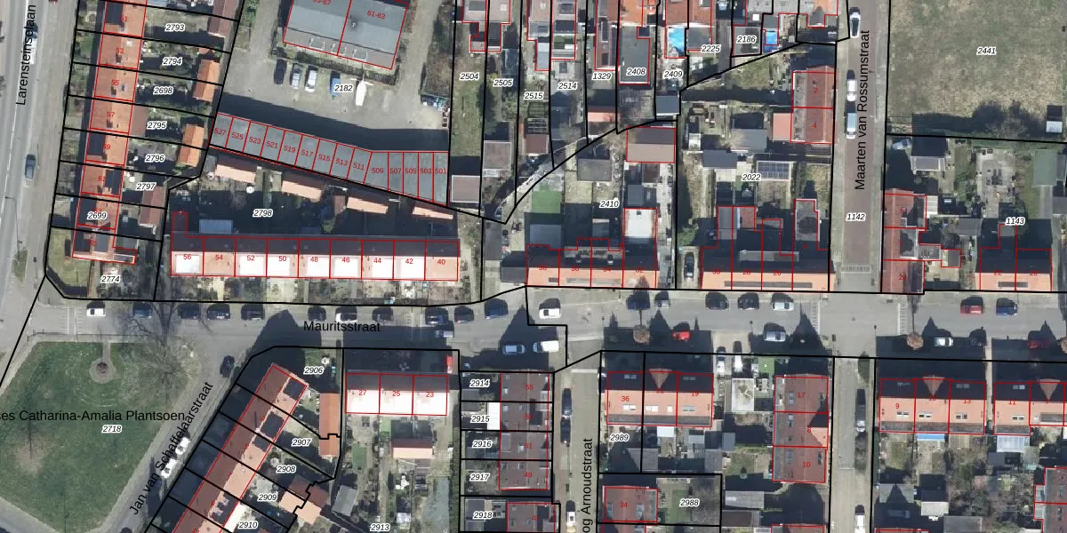 Het perceel waarop Mauritsstraat 38 staat heeft een oppervlakte van 908 m². Dit is een groot perceel. De perceeloppervlakte wordt geregistreerd door het Kadaster. Gedetailleerde informatie over de maten van dit perceel kunt u vinden in het rapport Kadastrale kaart met maatvoering van Mauritsstraat 38.