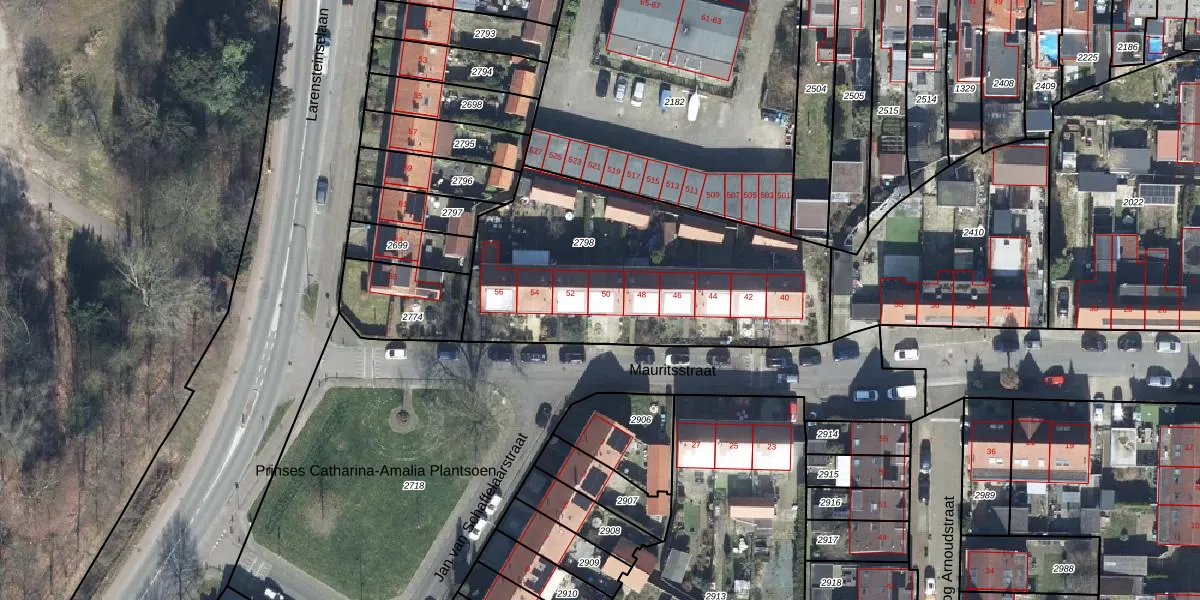 Het perceel waarop Mauritsstraat 50 staat heeft een oppervlakte van 1403 m². Dit is een zeer groot perceel. De perceeloppervlakte wordt geregistreerd door het Kadaster. Gedetailleerde informatie over de maten van dit perceel kunt u vinden in het rapport Kadastrale kaart met maatvoering van Mauritsstraat 50.