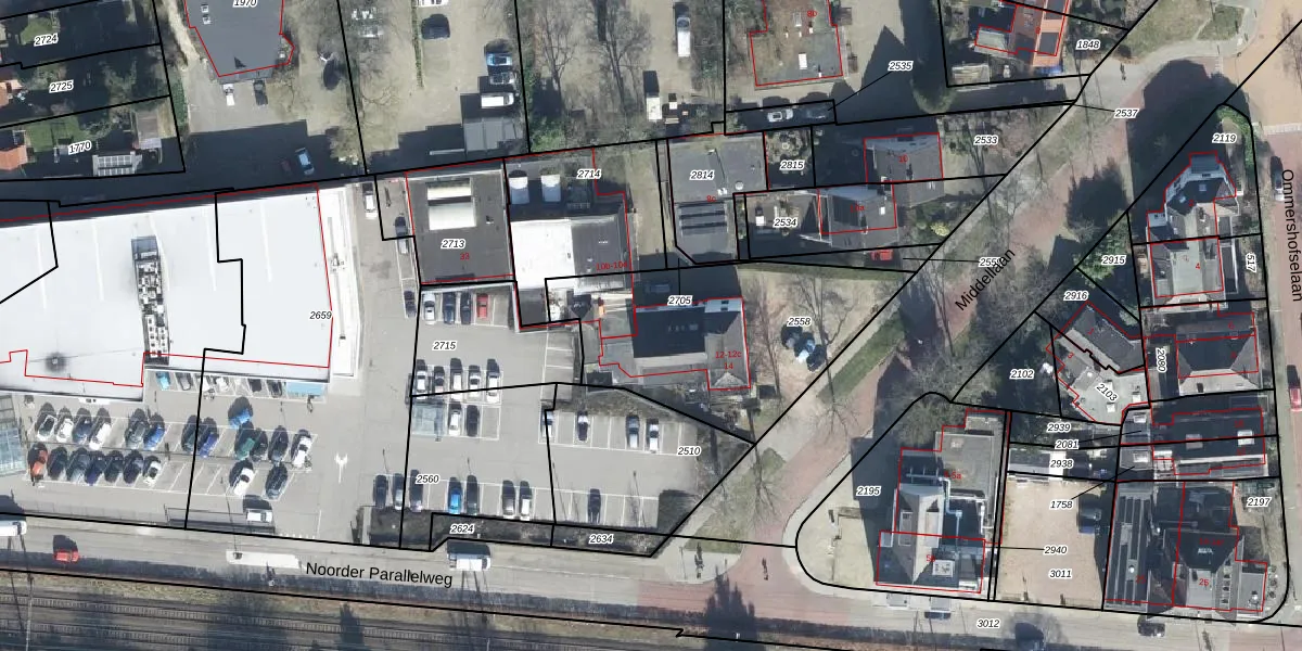 Het perceel waarop Middellaan 12-b staat heeft een oppervlakte van 970 m². Dit is een groot perceel. De perceeloppervlakte wordt geregistreerd door het Kadaster. Gedetailleerde informatie over de maten van dit perceel kunt u vinden in het rapport Kadastrale kaart met maatvoering van Middellaan 12-b.