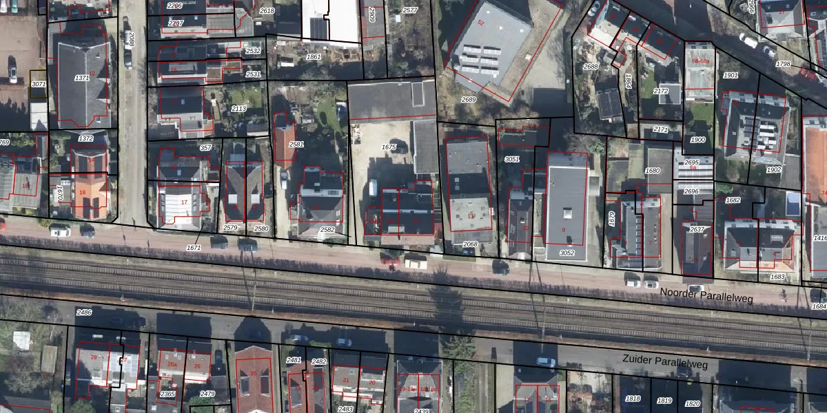 Noorder Parallelweg 13 is gelegen op kadastraal perceel VEL01F1675. Deze kadastrale aanduiding is uniek en wordt gebruikt door het Kadaster om eigendomsrechten en andere zakelijke rechten vast te leggen. Het perceel maakt onderdeel uit van de kadastrale gemeente Velp Gelderland.