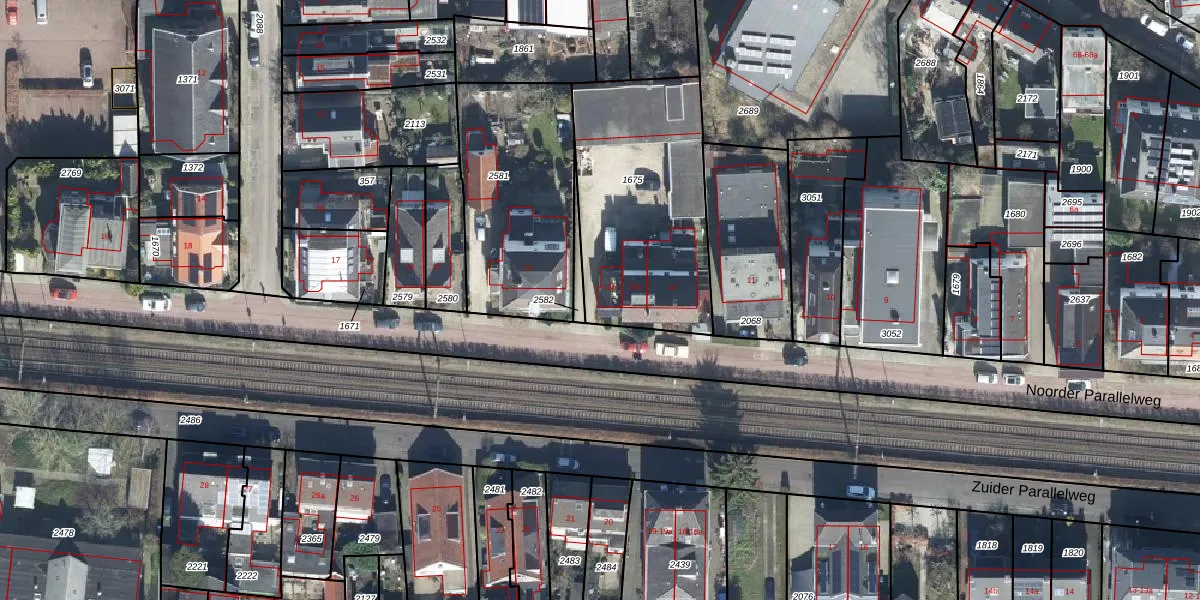 Noorder Parallelweg 13-b is gelegen op kadastraal perceel VEL01F1675. Deze kadastrale aanduiding is uniek en wordt gebruikt door het Kadaster om eigendomsrechten en andere zakelijke rechten vast te leggen. Het perceel maakt onderdeel uit van de kadastrale gemeente Velp Gelderland.