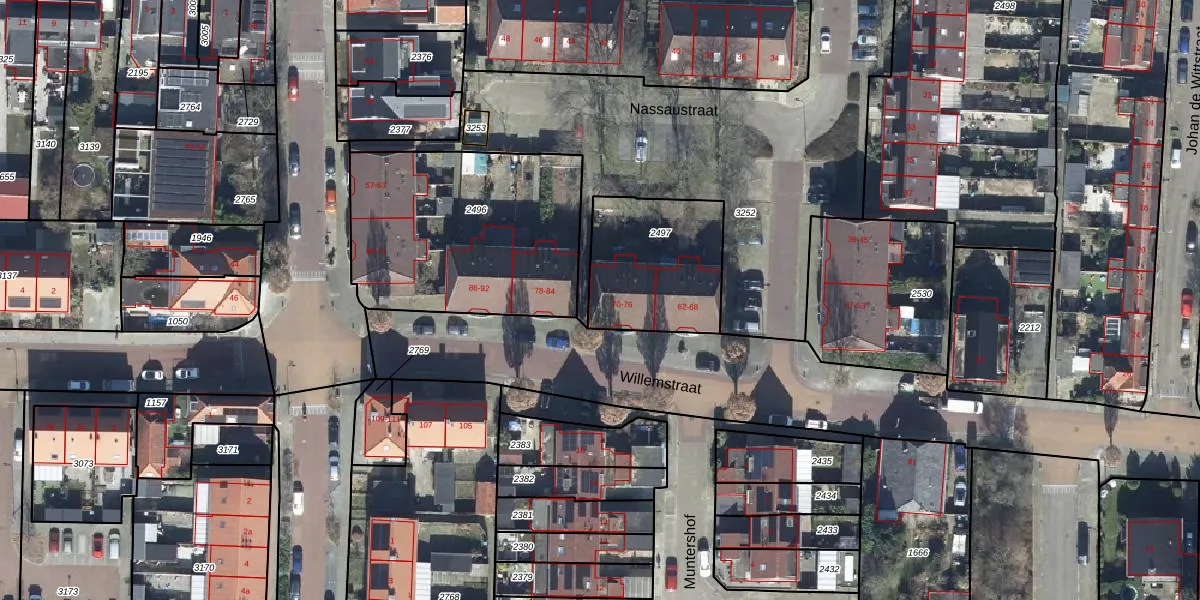Het perceel waarop Willemstraat 72 staat heeft een oppervlakte van 484 m². Dit is een groot perceel. De perceeloppervlakte wordt geregistreerd door het Kadaster. Gedetailleerde informatie over de maten van dit perceel kunt u vinden in het rapport Kadastrale kaart met maatvoering van Willemstraat 72.