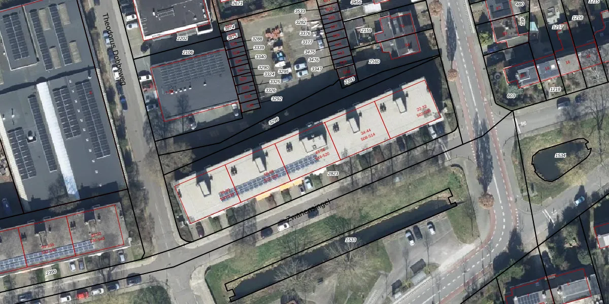 Het perceel waarop Zwanensingel 518 staat heeft een oppervlakte van 2370 m². Dit is een zeer groot perceel. De perceeloppervlakte wordt geregistreerd door het Kadaster. Gedetailleerde informatie over de maten van dit perceel kunt u vinden in het rapport Kadastrale kaart met maatvoering van Zwanensingel 518.