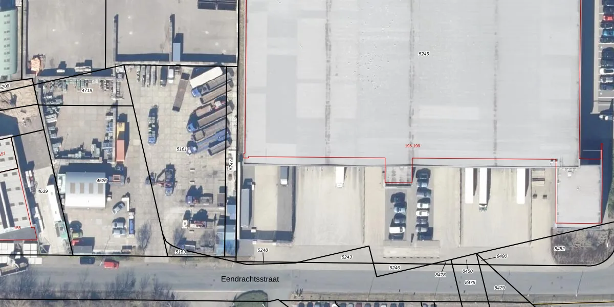 Eendrachtsstraat 195 is gelegen op kadastraal perceel VSN01B5245. Deze kadastrale aanduiding is uniek en wordt gebruikt door het Kadaster om eigendomsrechten en andere zakelijke rechten vast te leggen. Het perceel maakt onderdeel uit van de kadastrale gemeente Velsen.