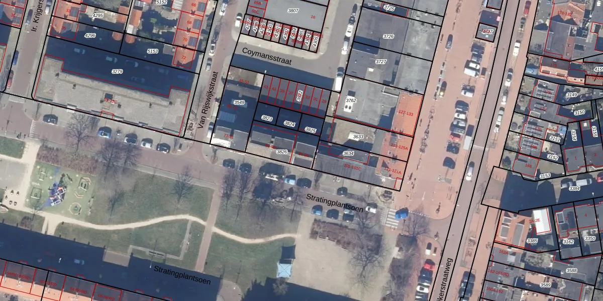 Stratingplantsoen 99 is gelegen op kadastraal perceel VSN01B3826. Deze kadastrale aanduiding is uniek en wordt gebruikt door het Kadaster om eigendomsrechten en andere zakelijke rechten vast te leggen. Het perceel maakt onderdeel uit van de kadastrale gemeente Velsen.
