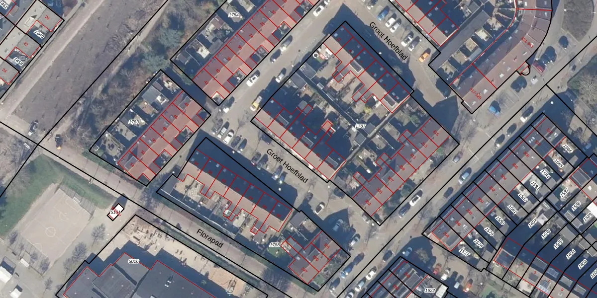 Het perceel waarop Groot Hoefblad 19 staat heeft een oppervlakte van 2360 m². Dit is een zeer groot perceel. De perceeloppervlakte wordt geregistreerd door het Kadaster. Gedetailleerde informatie over de maten van dit perceel kunt u vinden in het rapport Kadastrale kaart met maatvoering van Groot Hoefblad 19.