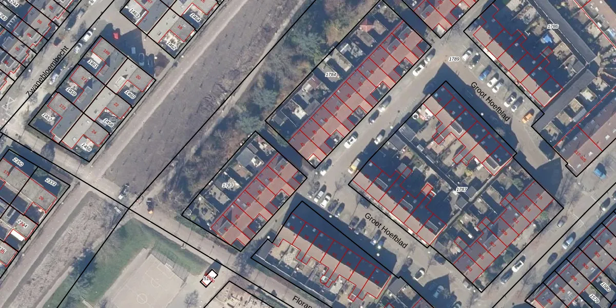 Het perceel waarop Groot Hoefblad 42 staat heeft een oppervlakte van 1225 m². Dit is een zeer groot perceel. De perceeloppervlakte wordt geregistreerd door het Kadaster. Gedetailleerde informatie over de maten van dit perceel kunt u vinden in het rapport Kadastrale kaart met maatvoering van Groot Hoefblad 42.