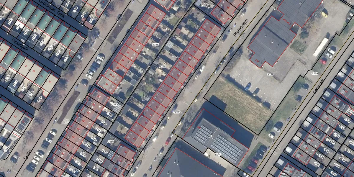 Het perceel waarop Platbodem 66 staat heeft een oppervlakte van 1940 m². Dit is een zeer groot perceel. De perceeloppervlakte wordt geregistreerd door het Kadaster. Gedetailleerde informatie over de maten van dit perceel kunt u vinden in het rapport Kadastrale kaart met maatvoering van Platbodem 66.