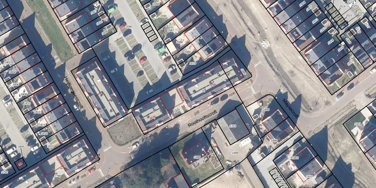 Het perceel waarop Roothooftscroft 20 staat heeft een oppervlakte van 1406 m². Dit is een zeer groot perceel. De perceeloppervlakte wordt geregistreerd door het Kadaster. Gedetailleerde informatie over de maten van dit perceel kunt u vinden in het rapport Kadastrale kaart met maatvoering van Roothooftscroft 20.