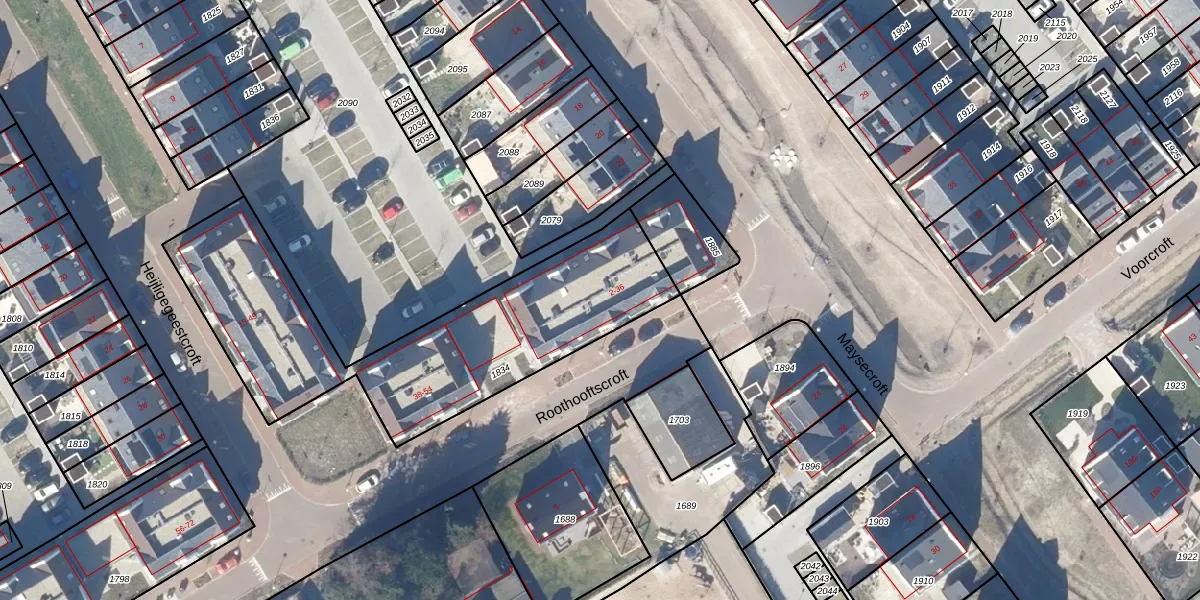Het perceel waarop Roothooftscroft 24 staat heeft een oppervlakte van 1406 m². Dit is een zeer groot perceel. De perceeloppervlakte wordt geregistreerd door het Kadaster. Gedetailleerde informatie over de maten van dit perceel kunt u vinden in het rapport Kadastrale kaart met maatvoering van Roothooftscroft 24.