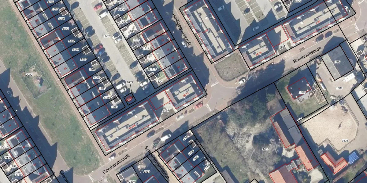 Het perceel waarop Roothooftscroft 58 staat heeft een oppervlakte van 1015 m². Dit is een zeer groot perceel. De perceeloppervlakte wordt geregistreerd door het Kadaster. Gedetailleerde informatie over de maten van dit perceel kunt u vinden in het rapport Kadastrale kaart met maatvoering van Roothooftscroft 58.