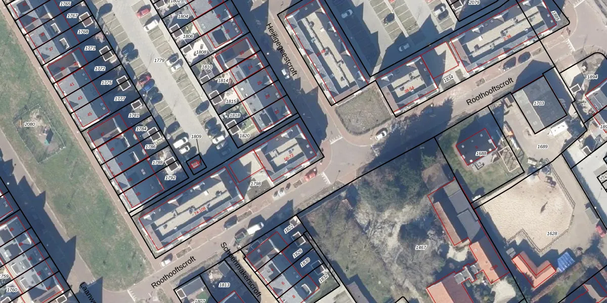 Het perceel waarop Roothooftscroft 66 staat heeft een oppervlakte van 1015 m². Dit is een zeer groot perceel. De perceeloppervlakte wordt geregistreerd door het Kadaster. Gedetailleerde informatie over de maten van dit perceel kunt u vinden in het rapport Kadastrale kaart met maatvoering van Roothooftscroft 66.