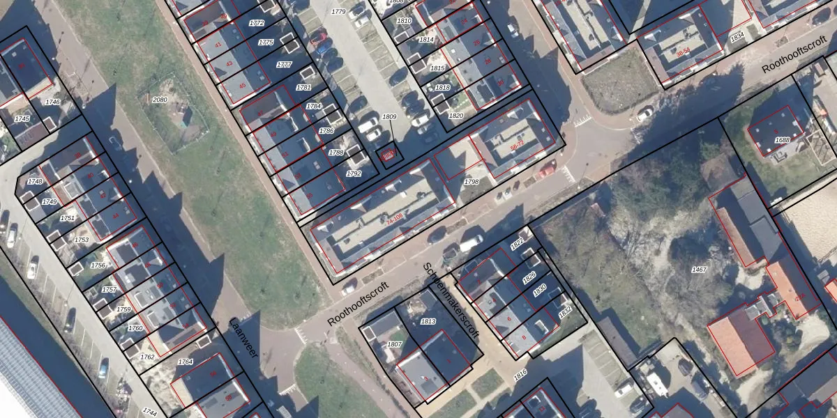 Het perceel waarop Roothooftscroft 82 staat heeft een oppervlakte van 1015 m². Dit is een zeer groot perceel. De perceeloppervlakte wordt geregistreerd door het Kadaster. Gedetailleerde informatie over de maten van dit perceel kunt u vinden in het rapport Kadastrale kaart met maatvoering van Roothooftscroft 82.