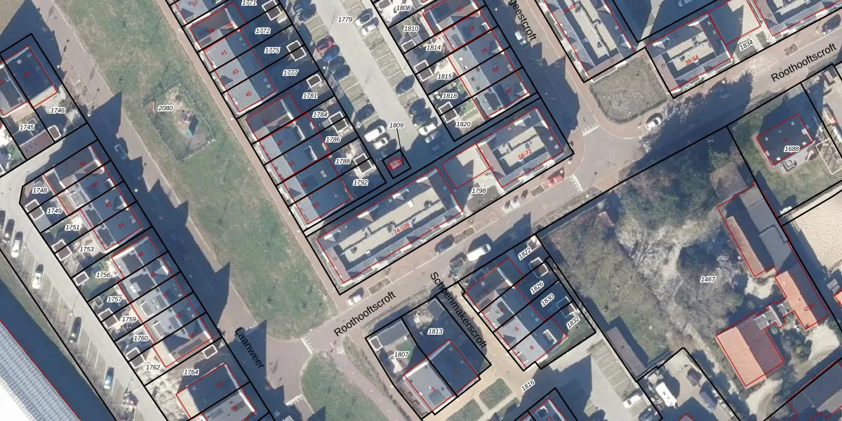 Het perceel waarop Roothooftscroft 88 staat heeft een oppervlakte van 1015 m². Dit is een zeer groot perceel. De perceeloppervlakte wordt geregistreerd door het Kadaster. Gedetailleerde informatie over de maten van dit perceel kunt u vinden in het rapport Kadastrale kaart met maatvoering van Roothooftscroft 88.