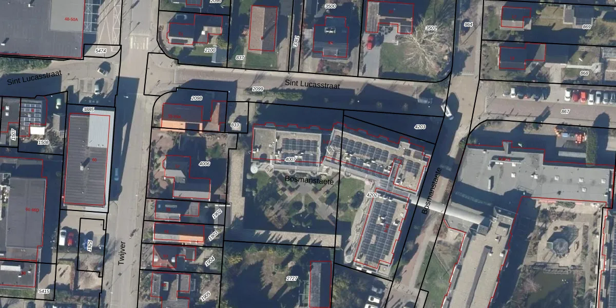 Het perceel waarop Bosmanstaete 3 staat heeft een oppervlakte van 1565 m². Dit is een zeer groot perceel. De perceeloppervlakte wordt geregistreerd door het Kadaster. Gedetailleerde informatie over de maten van dit perceel kunt u vinden in het rapport Kadastrale kaart met maatvoering van Bosmanstaete 3.