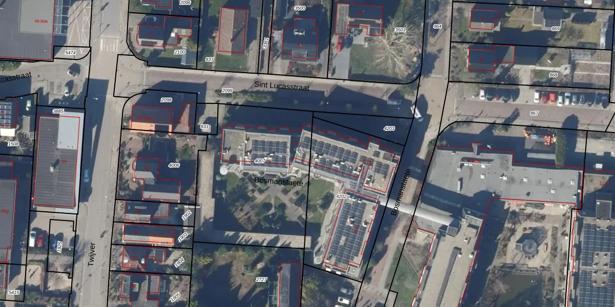 Het perceel waarop Bosmanstaete 5 staat heeft een oppervlakte van 1565 m². Dit is een zeer groot perceel. De perceeloppervlakte wordt geregistreerd door het Kadaster. Gedetailleerde informatie over de maten van dit perceel kunt u vinden in het rapport Kadastrale kaart met maatvoering van Bosmanstaete 5.