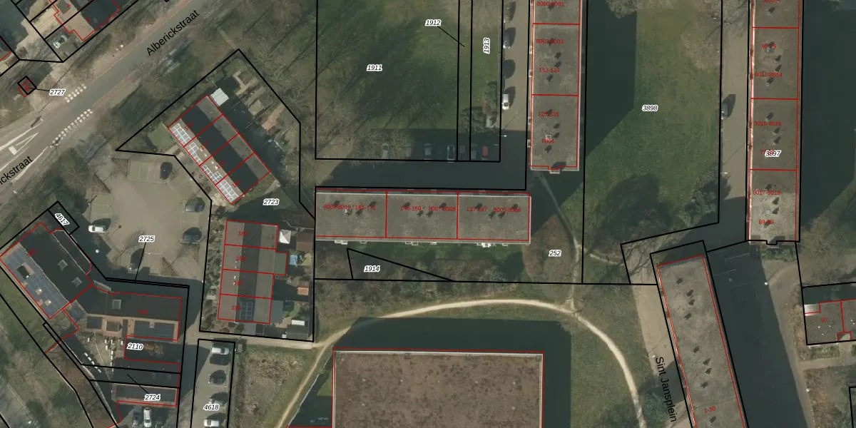 Het perceel waarop Alberickstraat 159 staat heeft een oppervlakte van 2050 m². Dit is een zeer groot perceel. De perceeloppervlakte wordt geregistreerd door het Kadaster. Gedetailleerde informatie over de maten van dit perceel kunt u vinden in het rapport Kadastrale kaart met maatvoering van Alberickstraat 159.