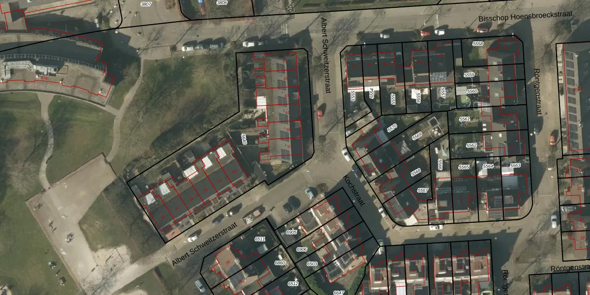 Albert Schweitzerstraat 57 is gelegen op kadastraal perceel VLO00A5640. Deze kadastrale aanduiding is uniek en wordt gebruikt door het Kadaster om eigendomsrechten en andere zakelijke rechten vast te leggen. Het perceel maakt onderdeel uit van de kadastrale gemeente Venlo.
