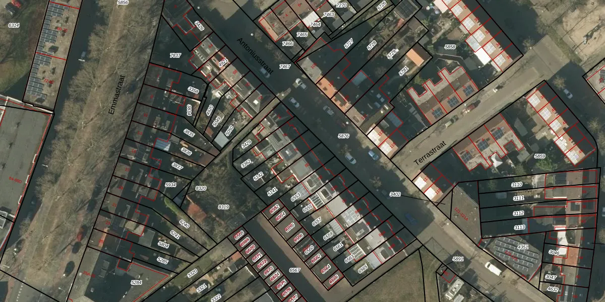 Het perceel waarop Antoniusstraat 78 staat heeft een oppervlakte van 172 m². Dit is een middelgroot perceel. De perceeloppervlakte wordt geregistreerd door het Kadaster. Gedetailleerde informatie over de maten van dit perceel kunt u vinden in het rapport Kadastrale kaart met maatvoering van Antoniusstraat 78.