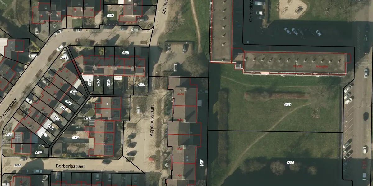 Het perceel waarop Appelbesstraat 56 staat heeft een oppervlakte van 1250 m². Dit is een zeer groot perceel. De perceeloppervlakte wordt geregistreerd door het Kadaster. Gedetailleerde informatie over de maten van dit perceel kunt u vinden in het rapport Kadastrale kaart met maatvoering van Appelbesstraat 56.